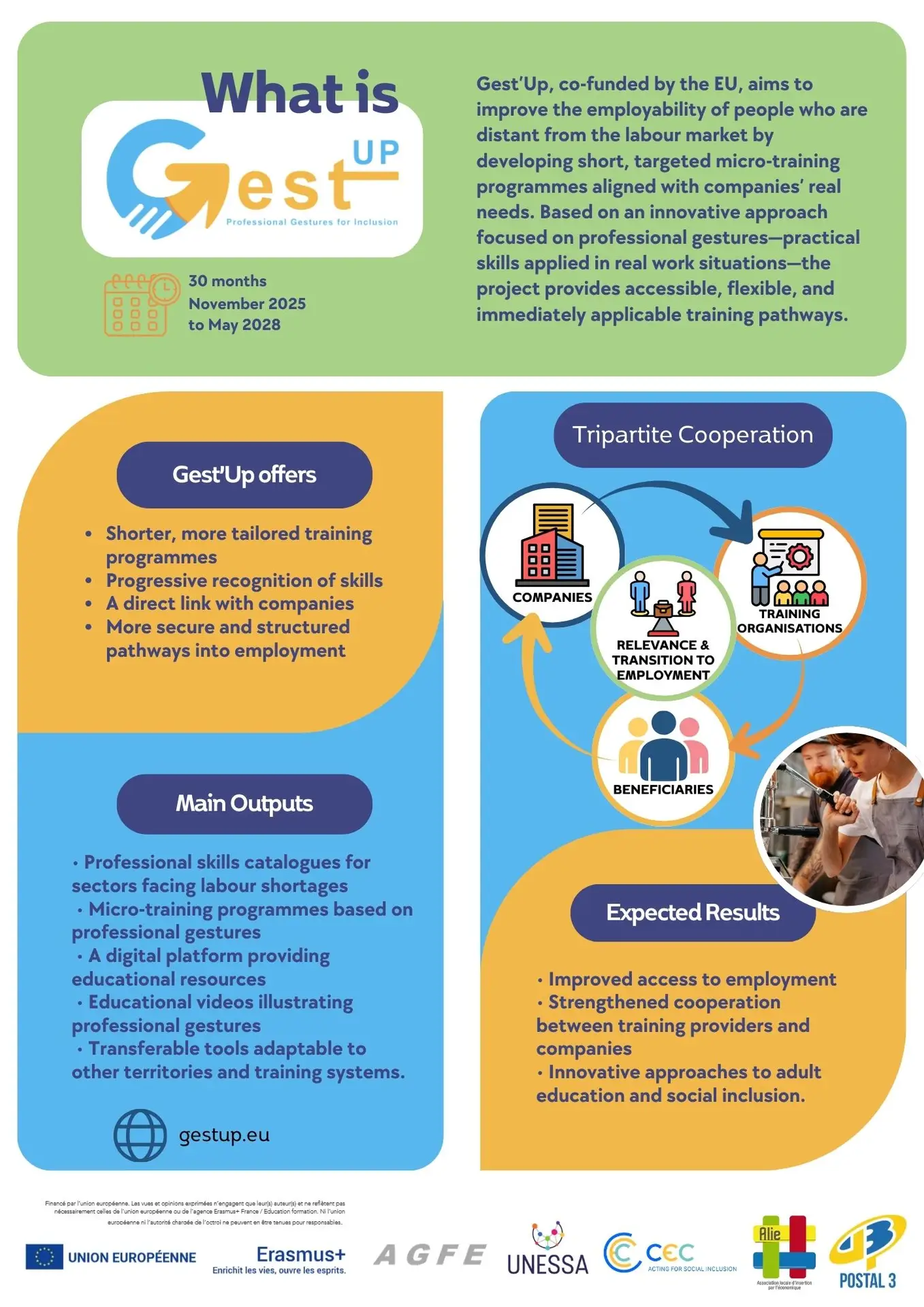 Gest’UP – Professional Gestures for Inclusion – is a European initiative that puts professional gestures — the concrete tasks carried out in real work situations — at the centre of integration and training pathways to improve the employability of people who are far from the labour market.